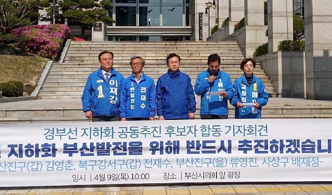 더불어민주당 부산진구갑 김영춘 후보와 부산진구을 류영진 후보, 북강서구갑 전재수 후보, 서동구 이재강 후보, 사상구 배재정 후보는 9일 오전 부산시의회 앞에서 경부선 철로 지하화 사업에 중앙당과 부산지역 출마 후보자들이 당력을 집중해 추진하겠다고 밝혔다.
