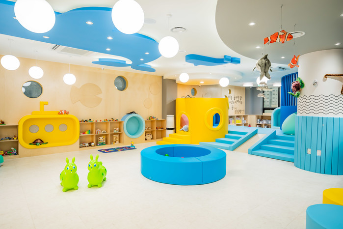 아쿠아리움을 테마로 한 ‘열린놀이터’는 아이들이 아늑한 공간에 숨어있길 좋아하는 특성을 반영해 곳곳에 오두막, 다락방 등을 조성했고, 신나게 뛰어놀 수 있도록 엠보 기능을 갖춘 바닥재로 안전성을 강조했다.