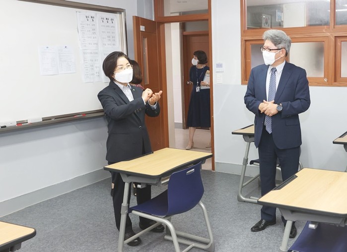 | ▲ 최근 대성고등학교를 방문한 김미경 구청장(왼쪽)이 방역수칙에 대해 설명을 하고 있다. (사진제공=은평구청) |