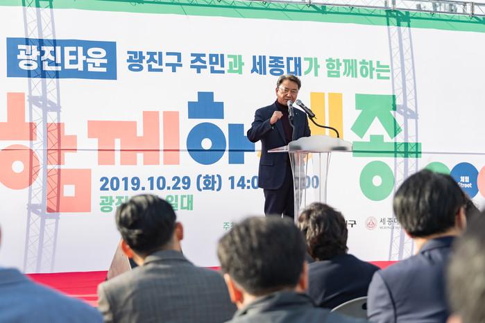 서울 광진구와 세종대학교가 최근 광진광장에서 광진구 지역주민과 세종대 학생들이 함께 어울리는 세종대 캠퍼스타운 페스티벌 ‘광진타운, 함께하세종’을 개최했다. 사진은 페스티벌에서 인사말을 하고 있는 김선갑 구청장의 모습. (사진제공=광진구청)