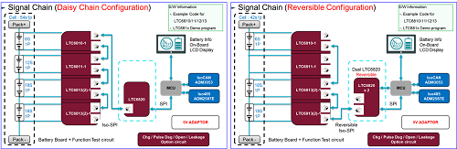 Battery Management 평가 보드는 BMS IC간 데이지 체인(Daisy Chain/Reversible Daisy Chain) 두 가지 모두 구현되어 있으며, 각각의 BMS IC에 대한 정보를 별도로 확인할 수 있다.