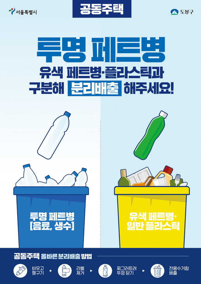 [시민일보 = 황혜빈 기자] 서울 도봉구(구청장 이동진)는 무색 페트병을 고품질 재생원료로 재활용할 수 있도록 폐비닐 및 투명 페트병을 다른 재활용품과 별도로 분리해 버리는 ‘폐비닐·폐페트병 별도 분리배출 요일제’를 시행하고 있다고 밝혔다.