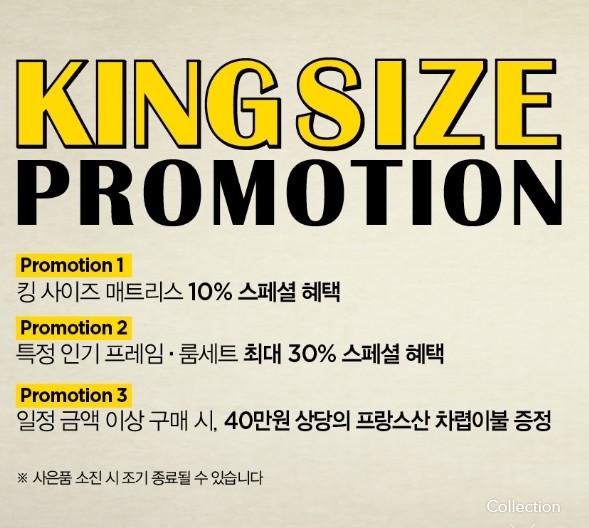 특히 킹사이즈 매트리스를 10% 할인하는 이벤트와 더불어 특정 프레임-룸세트를 30%까지 할인하는, 침대 브랜드로서 파격적인 이벤트에 눈길을 끈다.