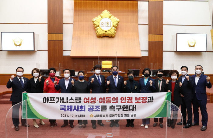 | ▲ '아프가니스탄 여성·아동의 인권 보장 및 국제사회 공조 촉구 결의안'을 채택한 도봉구의원들이 기념촬영을 하고 있다. (사진제공=도봉구의회) |