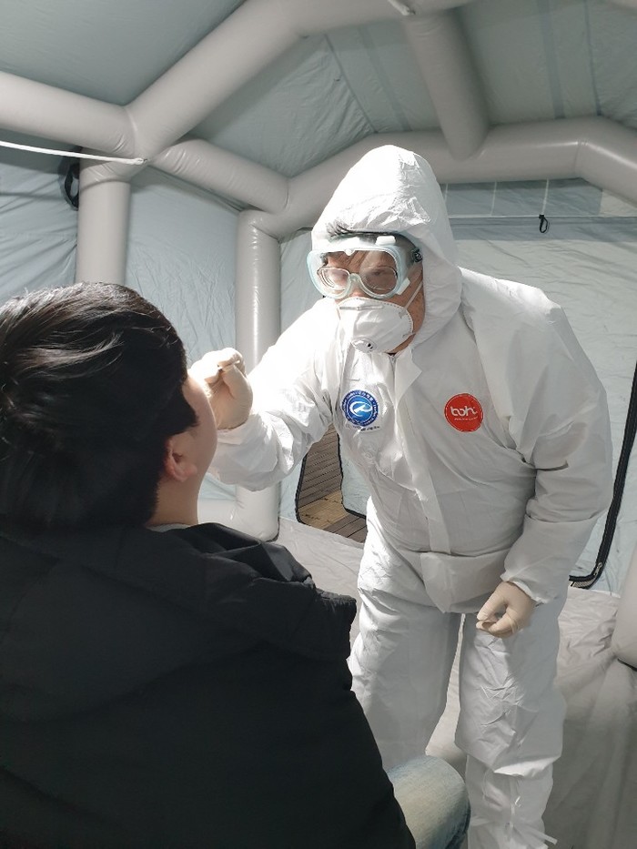 | ▲ (사진) 보건소 관계자 검체 채취 시연 모습 |