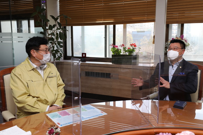 | ▲ 1일 도성훈 교육감과 면담을 하고 있는 정종연 의장(오른쪽). (사진제공=인천동구의회) |