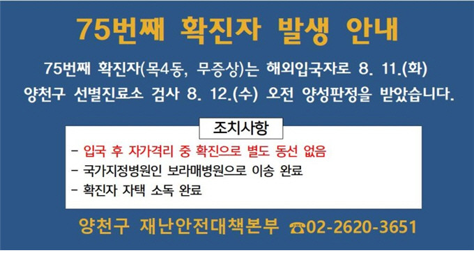 [시민일보 = 이대우 기자] 서울 양천구(구청장 김수영)에서 75번째 코로나19 확진자가 발생했다.