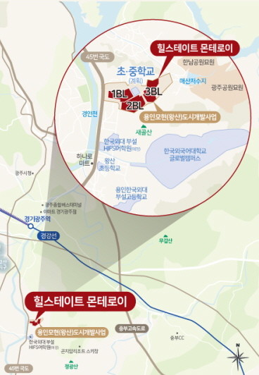 현대건설은 ‘힐스테이트 몬테로이’를 친환경 단지라는 키워드로 홍보하고 있다. 단지가 위치한 모현(왕산) 도시개발사업구역은 공원이 5만9,000여㎡, 녹지가 1만5,000여㎡가 계획돼 단지 곳곳에서 공원과 녹지를 접할 수 있다는 것이다. 일부 세대에서는 단지 앞 새골산과 공원 등 파노라마 조망이 가능하다고 설명한다.