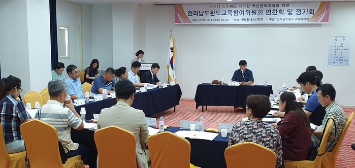 전남 완도교육지원청은 12일 완도원네스리조트에서 참여위원 21명이 참석한 가운데 완도교육참여위원회 연찬회 및 정기회를 했다. 사진은 참여자들이 교육참여위원회의 원활한 운영을 위한 ‘완도교육참여위원회 운영 세칙안’을 비롯한 2개의 안건에 대해 토의하는 모습. (사진제공=완도교육지원청)