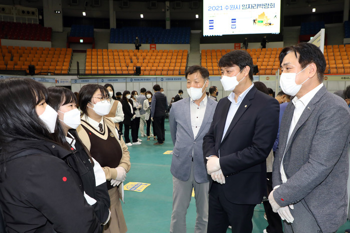 [수원=임종인 기자] 경기 수원시의회 조석환 의장과 양진하 기획경제위원장이 최근 수원종합운동장 실내체육관에서 열린 ‘2021 수원시 일자리박람회’ 현장을 찾았다.
