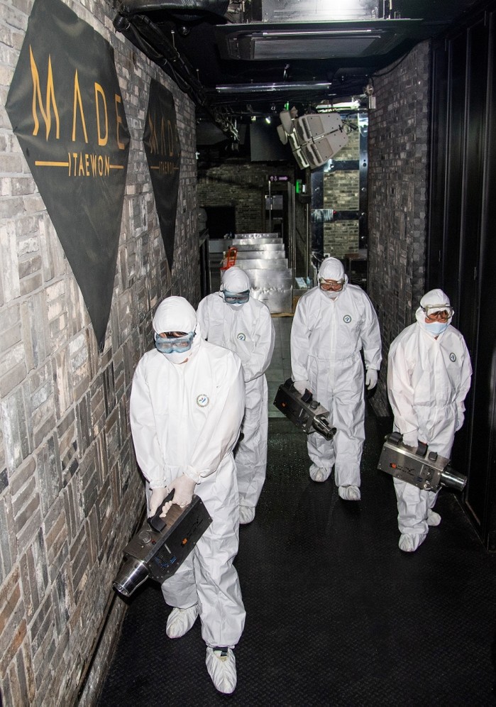 | ▲ 12일 구 보건소 방역요원들이 이태원 메이드 클럽 내부를 소독하고 있다. (사진제공=용산구청) |