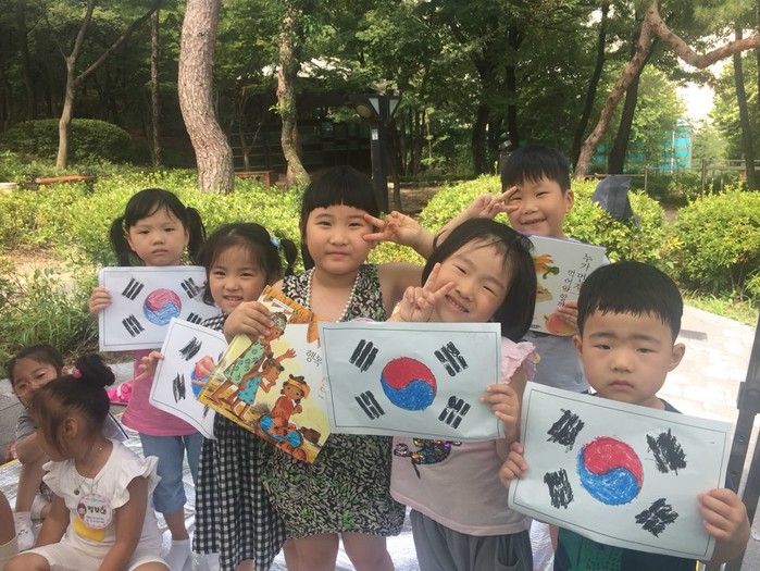 서울 강서구는 최근 구민 누구나 자유롭게 책을 볼 수 있도록 우장산근린공원 야외공연장 일대에서 ‘찾아가는 피서지문고’를 운영하고 태극기 색칠하기 등의 프로그램을 진행했다. 사진은 아이들이 직접 그린 태극기를 들고 기념촬영을 하는 모습. (사진제공=강서구청)