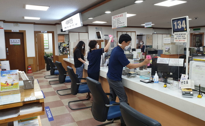경기 안산시 상록구 월피동행정복지센터는 코로나19 확산 방지를 위해 시설 방역 및 수시 소독 등 자체 방역활동을 강화해 추진하고 있다. 민원실 등에 매일 1회 이상 소독하고 있으며, 수시로 주민들의 손이 닿는 모든 시설을 꼼꼼히 소독하고 있다. 사진은 최근 직원들이 민원창구 가림막을 소독하고 있는 모습. (사진제공=안산시청)
