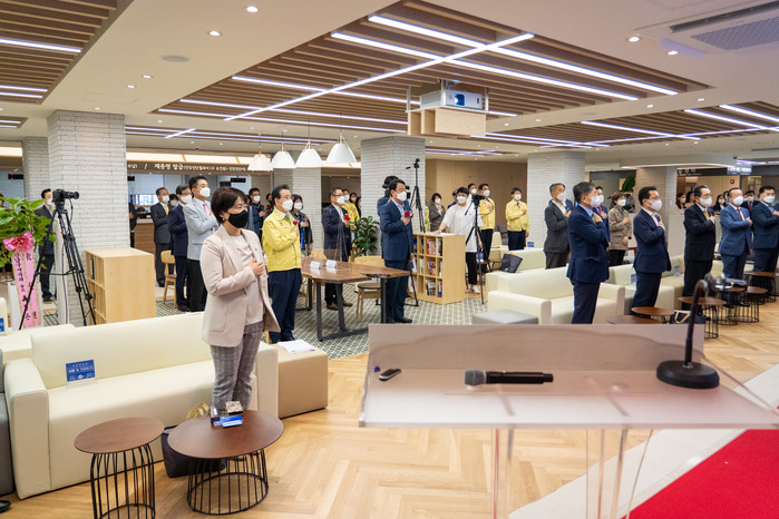 | ▲ 개소식에 참석한 강남구의회 의원들과 주요 참석 인사들이 국민의례를 하고 있다. (사진제공=강남구의회) |