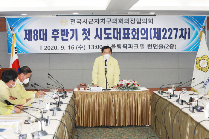 | ▲ 전국시군자치구의장협의회 회장인 조영훈 중구의장(가운데)이 8대 후반기 첫 시도대표회의를 진행하고 있다.(사진제공=중구의회) |
