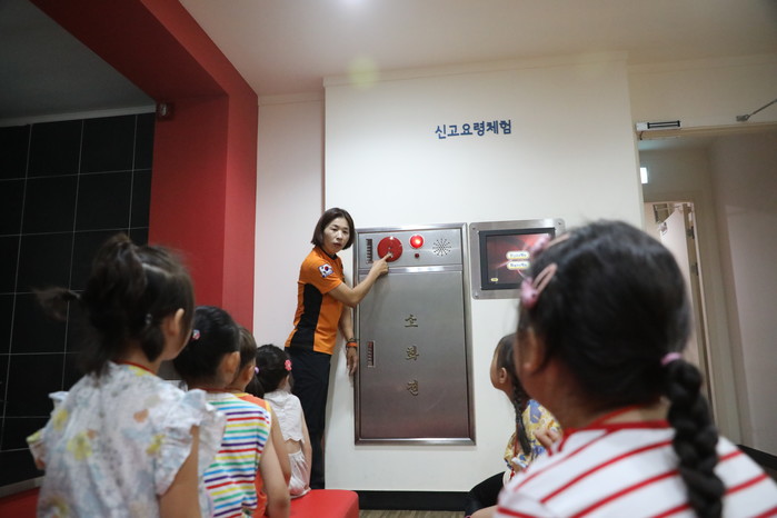 서울 마포소방서는 최근 꿈터유치원 어린이 22명을 대상으로 '안전 체험교육'을 실시했다. 이날 교육은 119 신고요령, 소화기 사용법, 지진체험, 연기대피 행동요령 등으로 진행됐다. 사진은 소화기 사용법 교육이 진행되고 있는 모습. (사진제공=마포소방서)