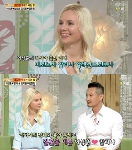 이상훈은 러시아인 아내 알리나를 소개하며 "원래 이름은 미로노바 알리나 알렉산드로보나"라며 "너무 길어서 저도 외우기 힘들다. 평소엔 알리나라고 부른다"고 말했다.