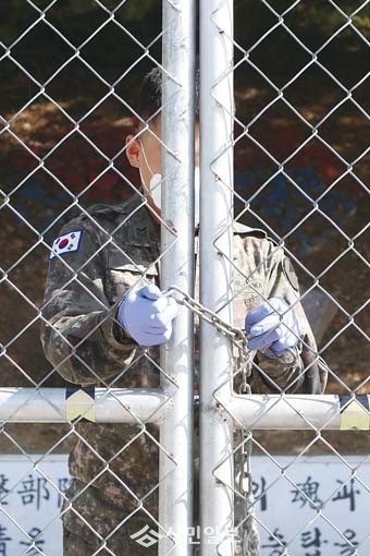 | ▲ 5일 경기 포천시의 한 육군 부대에서 군 관계자가 마스크와 장갑을 착용한 채 문을 닫고 있다. 이 부대에서 코로나19 확진자가 무더기로 발생해 군 당국이 포천 지역 전부대 외출을 통제했다.(사진제공=연합뉴스) |