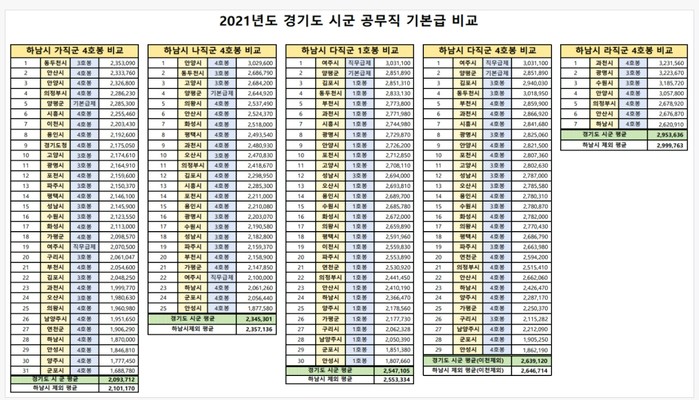이날 이 의원이 ‘2021년도 경기도 시·군 공무직 기본급 비교·분석’한 결과, 하남시 가직군(4호봉) 28위, 나직군(4호봉) 23위, 다직군(1호봉) 24위를 기록한 가운데 라직군(4호봉·도내 7개 시군)의 경우 7위로 최하위인 것으로 나타났다.