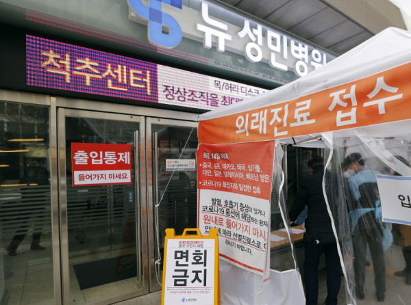 | ▲뉴 성민병원이 코로나19 확산을 막기 위해 면회객 출입통재 및 선별진료소를 운영하고 있다. |
