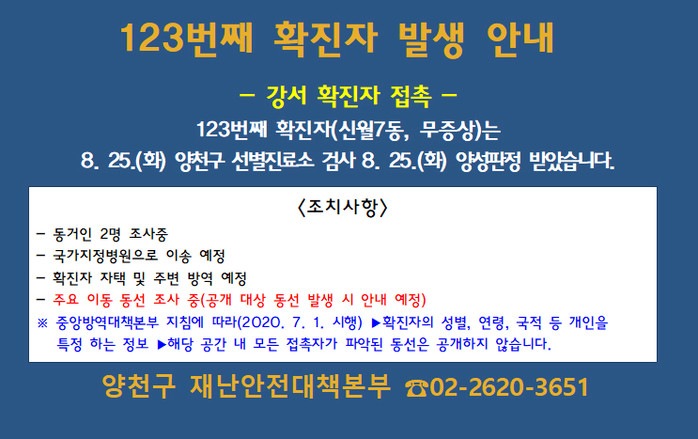 양천123번 확진자 A씨(신월7동 거주)는 무증상 확진자로, 강서구 확진자와 접촉했으며, 지난 25일 양천구보건소 선별진료소에서 검사를 받고 같은 날 오후 양성 판정을 받았다.