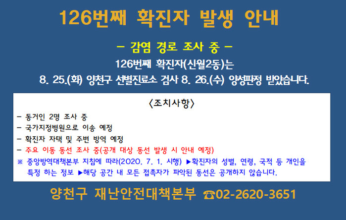 이로써 양천구의 코로나19 누적 확진자 수는 126명이 됐다.
