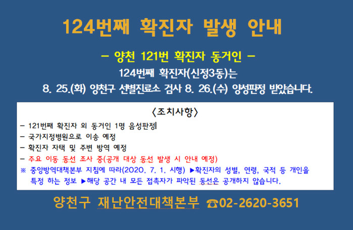 양천124번 확진자 B씨(신정3동 거주)는 양천121번의 동거인으로, 기침 증상이 발생해 검사를 받았으며, 양천125번 C씨(목5동 거주)는 발열 증상이 발생해 검사를 받았으나, 감염 원인은 현재 조사 중이다.