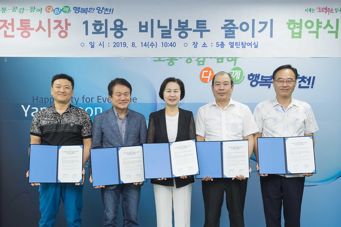 김수영 서울 양천구청장은 14일 구청 열린참여실에서 지역내 대형 전통시장 4곳 관계자가 참석한 가운데 열린 ‘비닐봉투 줄이기 협약식’에 참석했다. 사진은 김 구청장(가운데)과 전통시장 관계자들이 협약을 체결한 후 기념촬영을 하는 모습. (사진제공=양천구청)