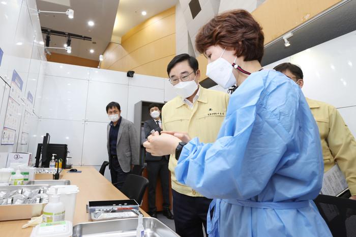 | ▲ 이동진 도봉구청장이 제2예방접종센터 모의훈련 현장을 찾아 의료진을 격려하고 접종과정을 살피고 있다.(사진제공=도봉구청) |