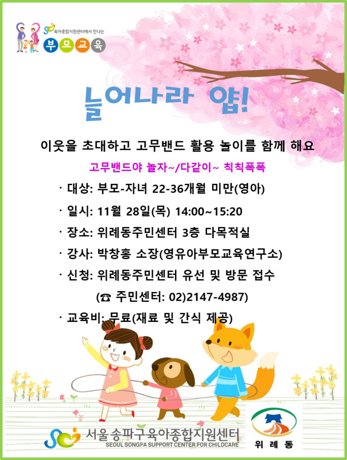 참가를 희망하는 22개월 이상 36개월 미만의 영아를 둔 부모 12명을 선착순 모집한다. 신청은 강의시작 전까지 위례동 주민센터에 방문하거나 전화로 신청하면 된다(수강료 무료).