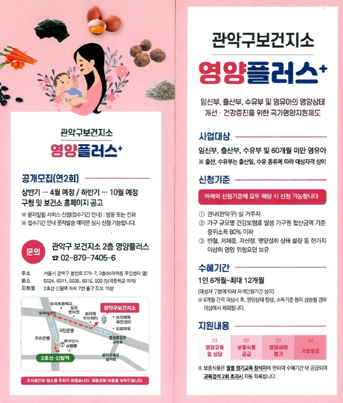 사업 대상은 ▲관악구에 주소를 둔 기준 중위소득 80% 이하의 임산부▲출산수유부(지난 7월1일 이후 출산 및 모유수유자) ▲만 60개월 이하 영·유아(2015년 1월1일 이후 생일자) 등이다.