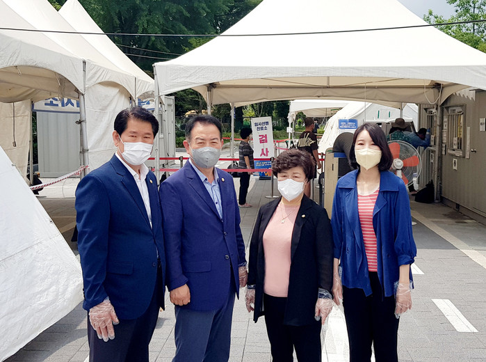 최근 서울 강동구의회 의원들이 코로나19 선별진료소를 방문해 주민들의 의견을 청취하고 의료진 및 관계자들을 격려했다. 사진은 현장을 방문한 의원들의 모습. (사진 좌측부터 강동구의회 양평호·김연후·한경혜·정미옥 의원) (사진제공=강동구의회)