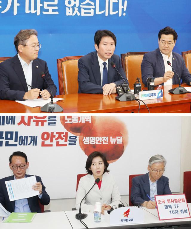 더불어민주당 이인영 원내대표가 1일 오전 국회에서 열린 기자간담회에서 조국 법무부 장관 후보자 인사청문회와 관련해 “내일 오전에 법제사법위를 개최해서 청문계획서를 의결하면 내일부터 당장 인사청문회가 시작될 수 있다”며 “자유한국당이 끝까지 인사청문회를 열지 않고자 한다면 우리는 국민과 직접 만나는 길을 택하겠다”고 말하고 있다(위).