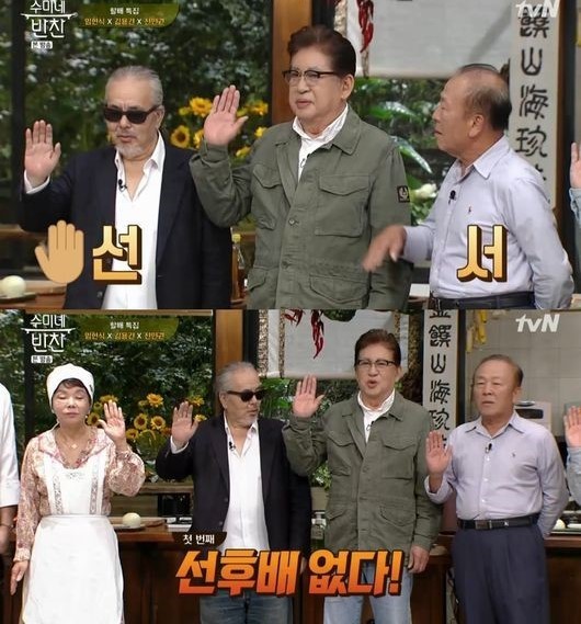 18일 방송된 tvN 예능 '수미네반찬'에서 김수미는 "한달 동안 만든 할배특집"이라면서 함께할 영광의 '방탄할배단' 주인공들로 배우 김용건, 임현식, 가수 전인권이 출연했다. 세 사람은 "제대로 배우 앞으로 식습관 바꾸는 좋은 계기가 되길 바란다"며 기대감에 찼다. 김수미는 "이 시간만큼은 후배아닌 선생님"이라면서 "선후배 없다, 무조건 선생님"이라 선서했고, 시작부터 살벌하다며 긴장했다.