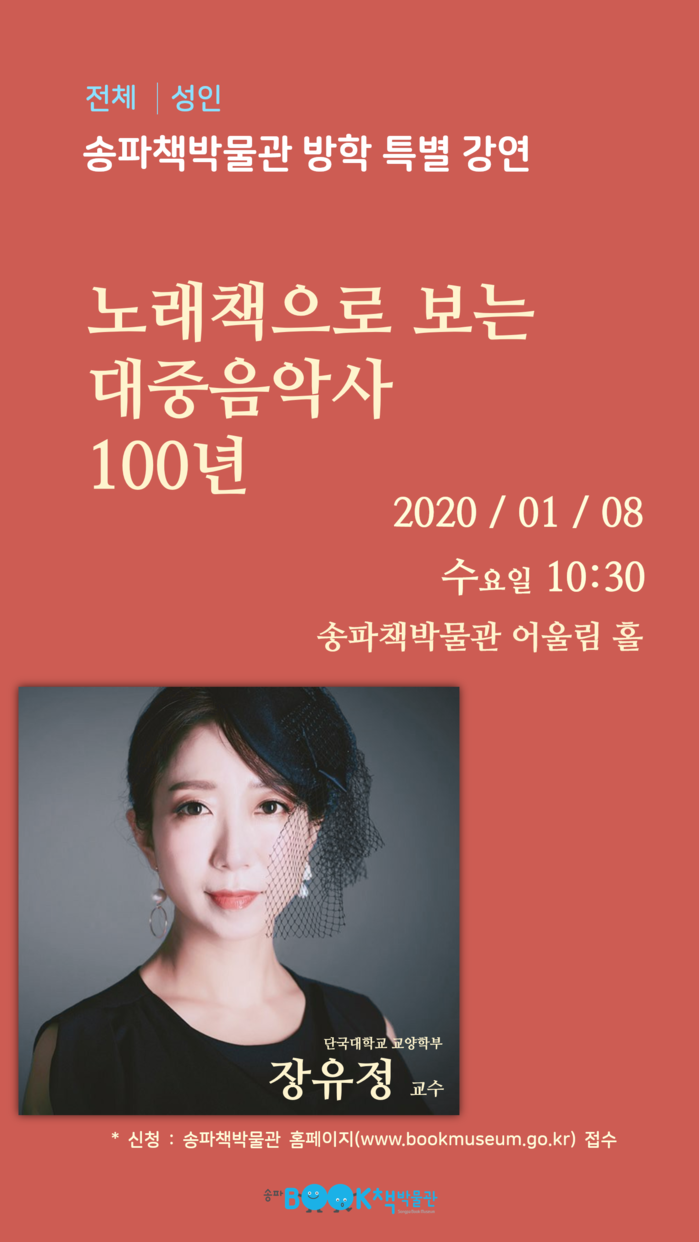 노래책으로 보는 대중음악사 100년을 주제로 진행하는 이번 강연에서는 장유정 단국대 교수가 노래책에 얽힌 다양한 사연과 대중가요사의 흐름을 알기 쉽게 풀어낼 예정이다.