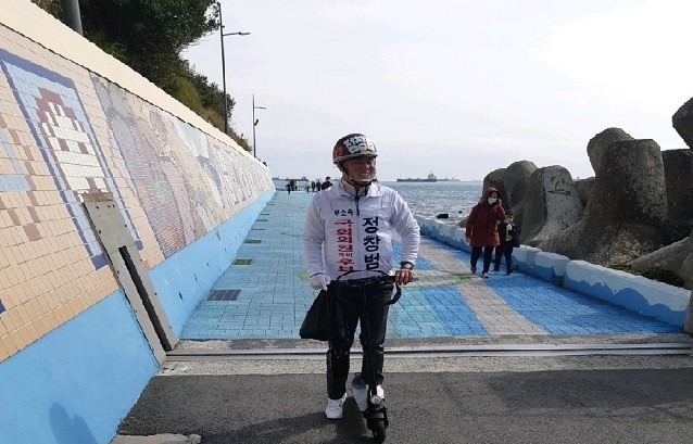 오후 2시, '코로나19'로 일일이 악수도 명함도 건 내지 못하는 선거운동이 계속된다. 보는 사람마다 큰 소리로 "무소속 정창범 입니다"라고 우렁차게 인사하는 것이 전부다. 한가지 특별한 것이 있다면 이동할 때 킥보드를 타고 간다는 것. 헬멧과 하얀 선거복 곳곳에 ’무소속 정창범‘이라는 문구가 빼곡하다.