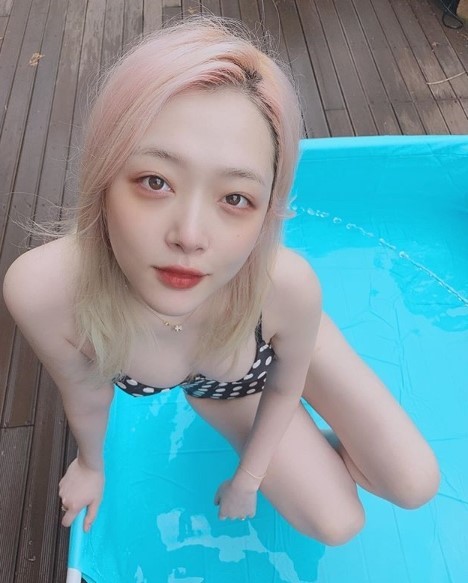 설리의 SNS에는 다양한 사진들이 게재돼 있다. 공개된 사진 속 설리는 도트 무늬 수영복을 입고 러블리한 비주얼을 자랑하고 있다. 진한 메이크업을 하지 않아도 빛나는 설리의 백옥 피부와 완벽한 미모가 특히 시선을 사로잡는다.