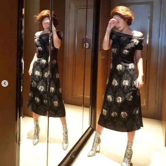 김성령은 자신의 sns에 사진 한 장을 게재했다. 사진 속 김성령은 어깨선이 보이는 섹시한 드레스를 입고 사진을 찍고 있다.