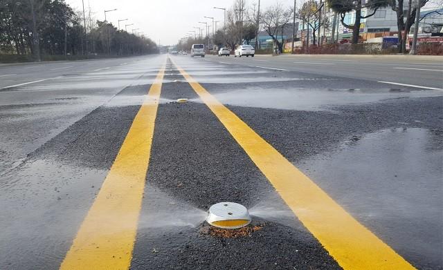 클린로드 시스템은 도로 중앙분리대에 설치해 놓은 살수 노즐을 통해 유출 지하수를 분사해 도로를 세척하게 된다.