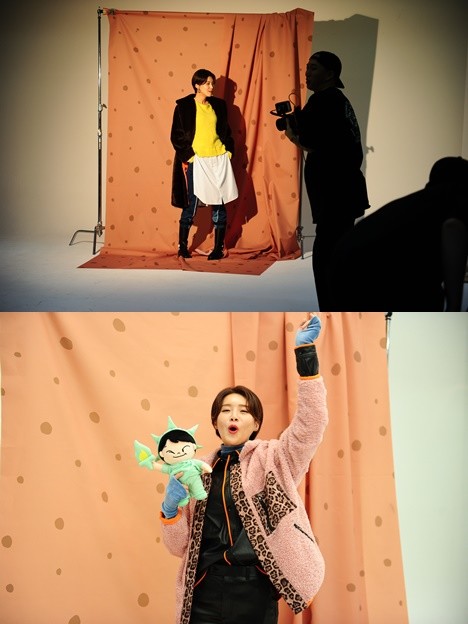 | 장도연이 떡볶이펍 뉴욕즉석떡볶이의 마스코트 뉴요기 인형을 들고 포즈를 취하는가 하면 Anc1.5 에코퍼를 입고 화보 촬영을 진행하고 있다 |