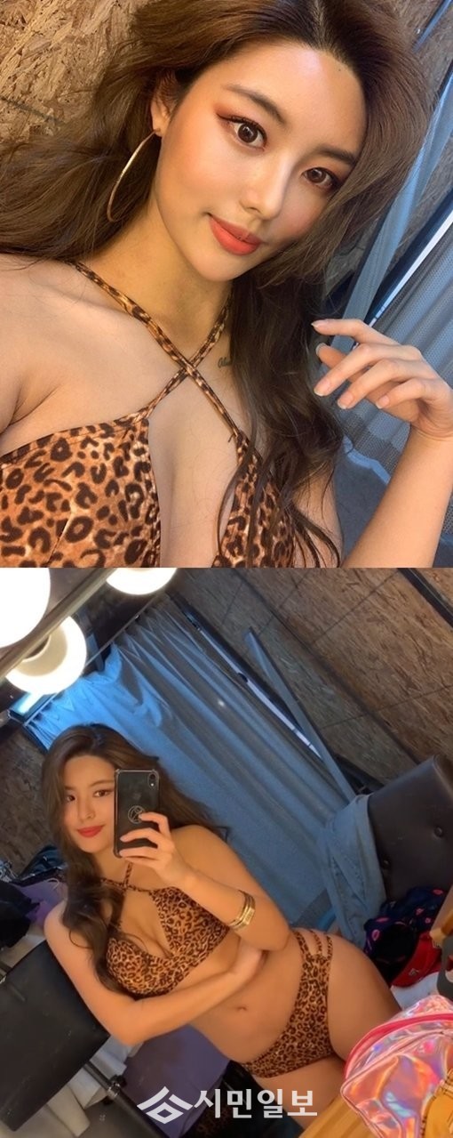 사진에는 호피무늬 비키니를 입은 정유나가 핸드폰으로 거울 셀카를 찍고 있는 모습이 담겨 감탄을 자아냈다.