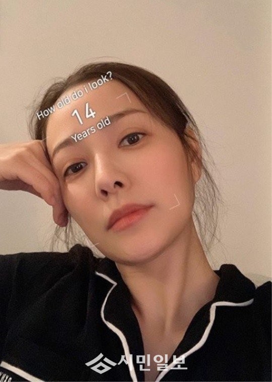 공개된 사진 속 손태영은 스마트폰 어플을 이용해 나이를 인식하고 있는 모습으로 인식 결과 14살이라는 결과가 나와 감탄을 자아냈다.
