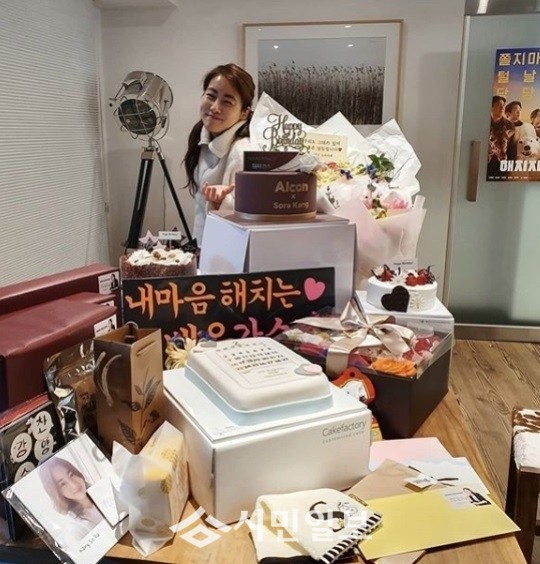 공개된 사진 속 강소라는 생일 선물을 쌓아놓고 인증샷을 남기고 있는 모습으로 훈훈함을 자아냈다.