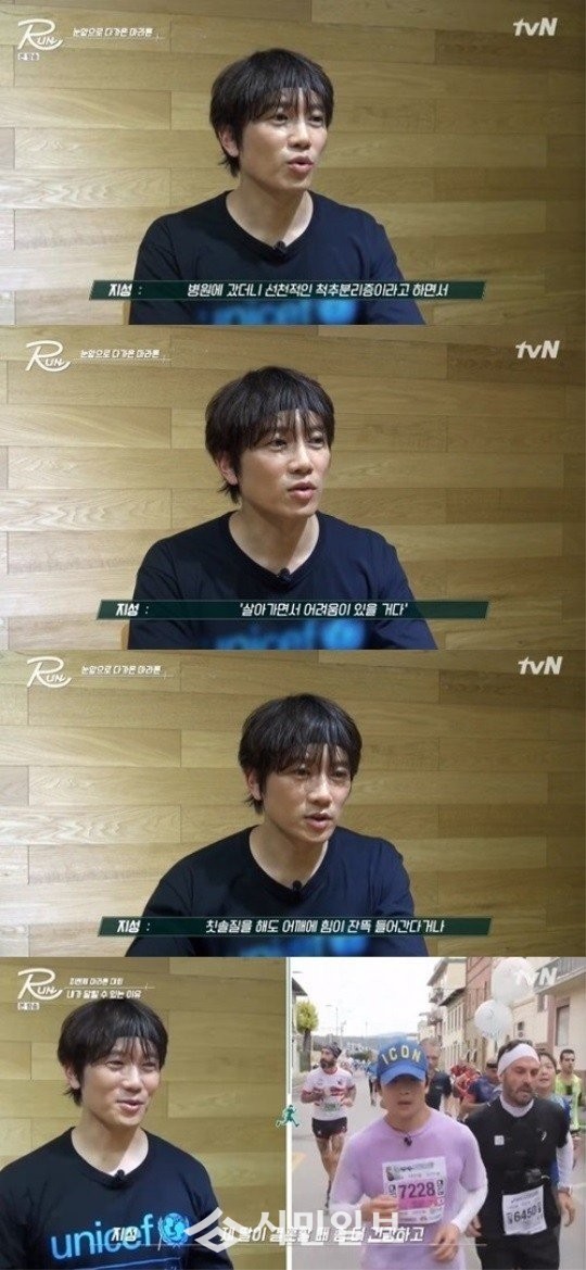 마라톤에 나서기 전날, 지성은 경기를 앞두고 긴장되는 마음을 드러냈다. 특히 그는 자신이 앓고 있는 질병에 대해 언급했다. 지성은 "병원에 갔더니 선천적인 척추분리증이라고 하더라"라며 "살아가면서 어려움이 있을 거라는 말을 들었는데 남들은 칫솔질을 그냥 하지만 저는 어깨에 힘이 많이 들어가서 힘들다"고 고백했다.