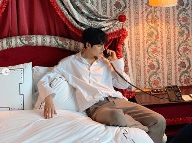 사진 속에서 이민호는 화려한 인테리어의 침대 위에서 전화를 받는 옆태를 보여주고 있다. 이민호는 셔츠를 입고 오똑한 이목구비를 자랑했다. 이민호의 독보적인 외모가 빛이 난다.