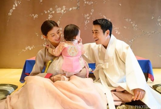 딸의 얼굴은 공개되지 않았지만, 주상욱은 딸을 보며 함박웃음을 짓고 있어 눈길을 끈다. 단아한 한복을 입은 세 식구의 모습이 훈훈함을 자아낸다.