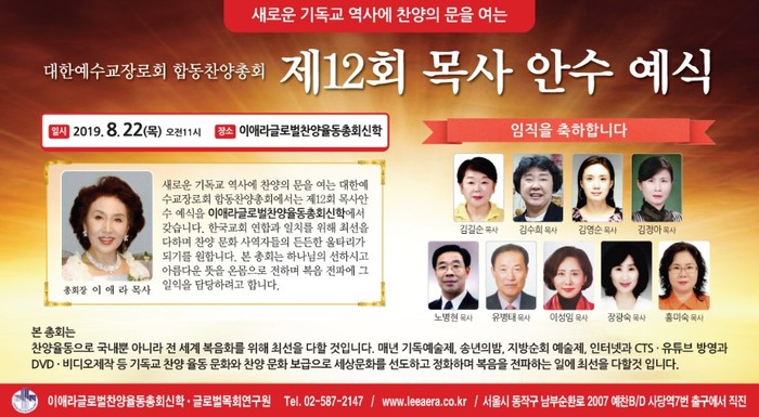 [오왕석 기자]대한예수교장로회 합동찬양총회(총회장 이애라)는 지난 22일 이애라 글로벌 찬양율동 총신학회에서 제12회 목사안수 예식을 갖고 김영순 목사 등 6명에 대한 목사안수 예배가 열렸다.