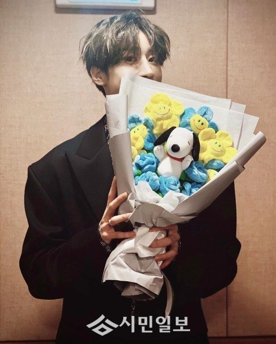 사진 속 한승우는 자신과 닮은 스누피가 들어간 꽃다발을 들고 귀여운 매력을 과시하며 여심을 사로잡았다.
