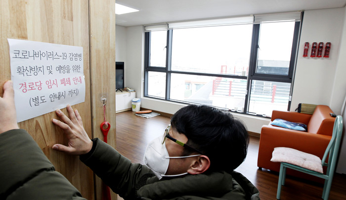 | ▲ 동작구 관계자가 경로당 임시 휴관 안내문을 붙이고 있다. |