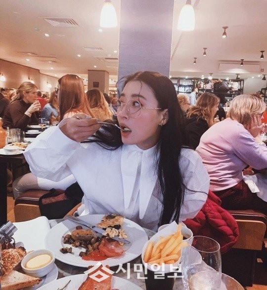 공개된 사진 속 황보는 금테 안경과 깃이 뾰족한 셔츠로 미모를 뽐내며 식사를 즐기고 있는 모습으로 시선을 사로잡았다.